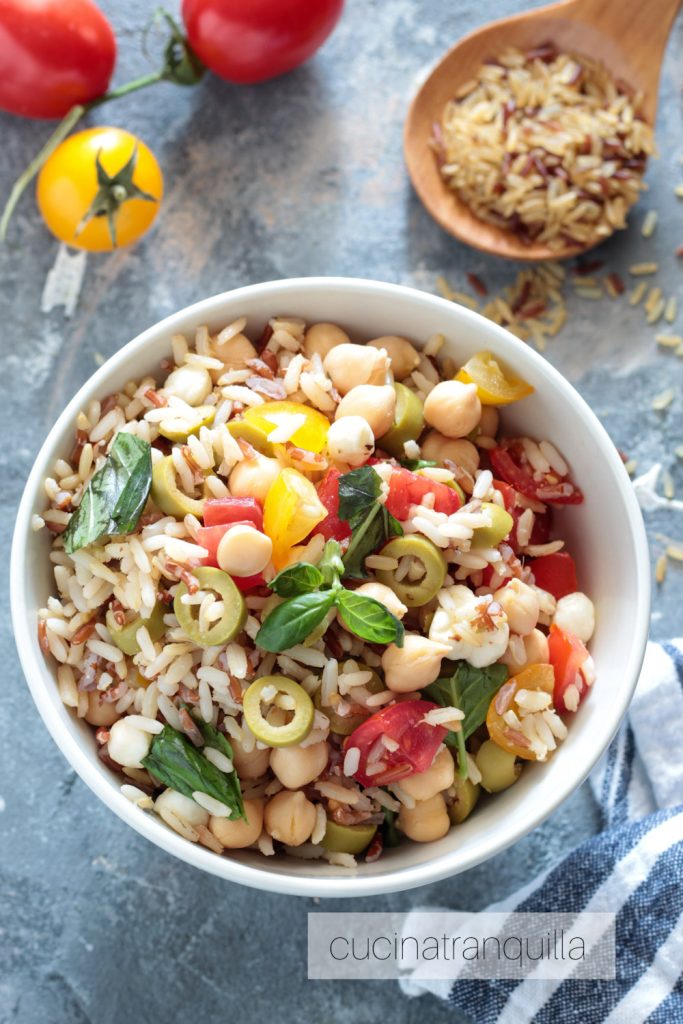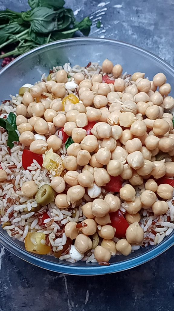 Volkoren rijstsalade met cherrytomaatjes en kikkererwten, een frisse, simpele en snelle recept.