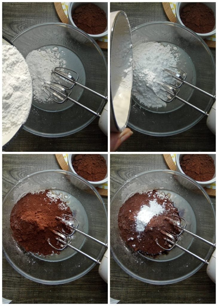 Voeg nu de droge ingrediënten toe, begin met de bloem, ga verder met het aardappelzetmeel, het bakpoeder en de ongezoete cacao.