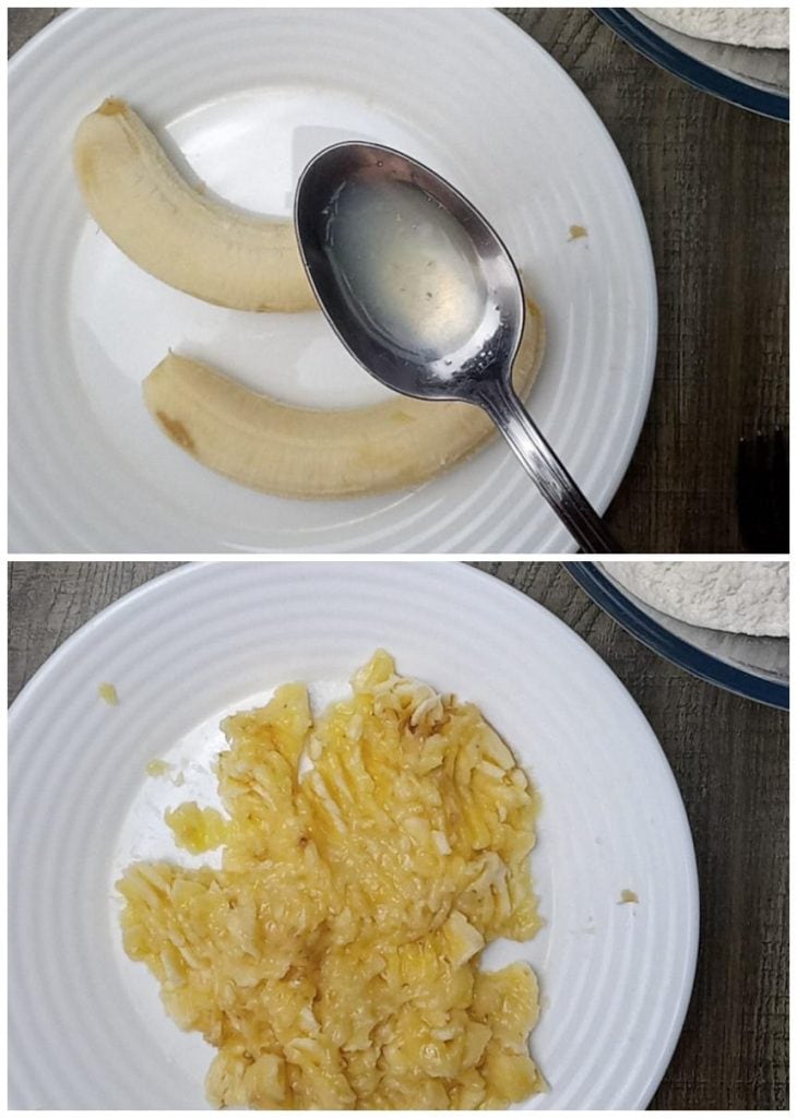 • Om zachte bananenmuffins te maken, prak eerst twee rijpe bananen, nadat je ze hebt geschild, samen met een theelepel geperste limoen of citroen.