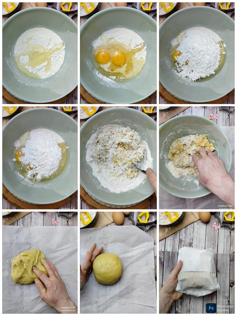 In een kom voeg je aan de bloem het snufje fijne zout toe, de zonnebloemolie, de eieren, de poedersuiker en begin je alle ingrediënten eerst in de kom en daarna op het werkblad te mengen.