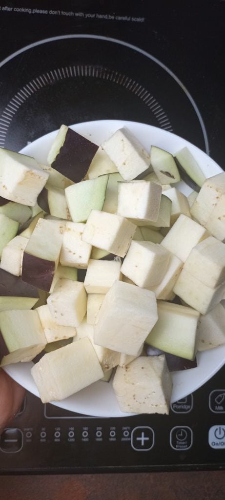 Verwijder de steel van de aubergines, snijd ze in plakjes, in reepjes en vervolgens in blokjes.
