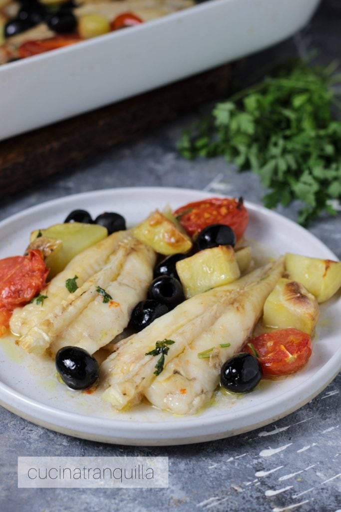 Als de vis te gaar is en de aardappelen nog niet gaar zijn, dek de ovenschaal dan af met aluminiumfolie en ga verder met bakken tot de aardappelen gaar zijn.