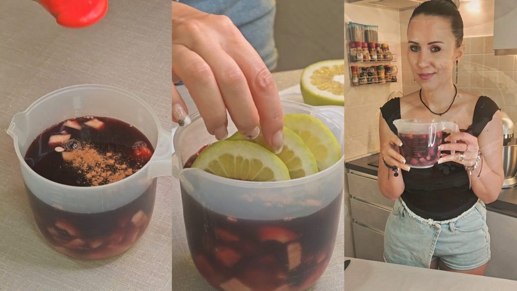 • Bereid het fruit voor, maak het schoon en snijd het fruit naar keuze in stukjes. Meng en plaats het in een kom. Voeg de wijn, siroop (water en suiker) toe,