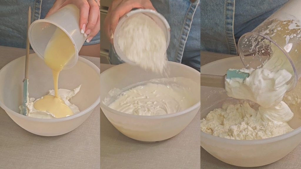 In een kom meng mascarpone, kokosyoghurt en gecondenseerde melk tot een gladde crème.Voeg de geraspte kokos en de vanille toe.Klop de slagroom en meng deze voorzichtig met opwaartse bewegingen.