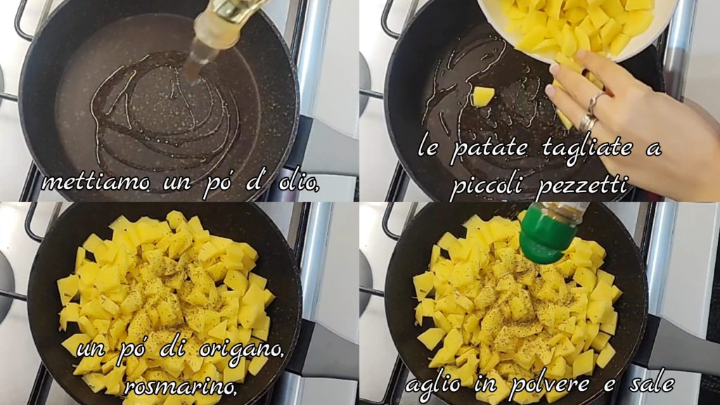 Eerst maken we de aardappelen schoon, wassen ze en snijden ze in stukjes. In een pan doen we wat olie, voegen de aardappelen toe, wat oregano, rozemarijn, knoflookpoeder en zout.