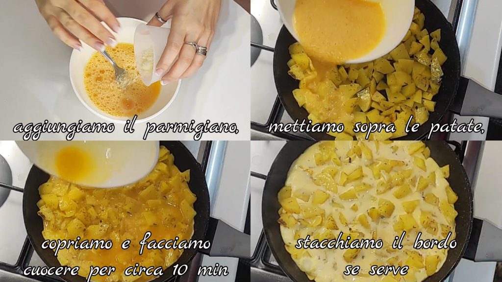 We voegen de Parmezaanse kaas toe en mengen. We gieten het mengsel bovenop de aardappelen. We dekken af en laten het nog ongeveer 10 minuten koken. We maken de rand los met een spatel als dat nodig is.