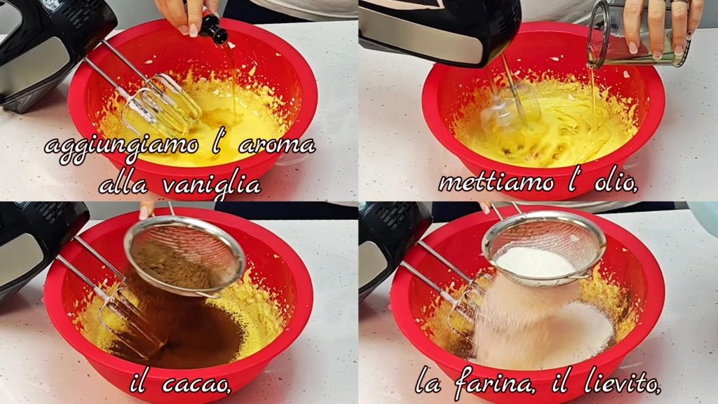 Voeg het vanille aroma, de olie, cacao, bloem, bakpoeder toe.
