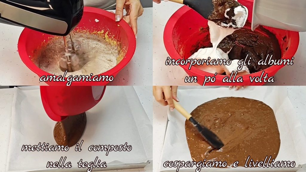 Meng. Voeg de eiwitten beetje bij beetje toe. Doe het verkregen mengsel in de vorm. Verspreid en egaliseer.