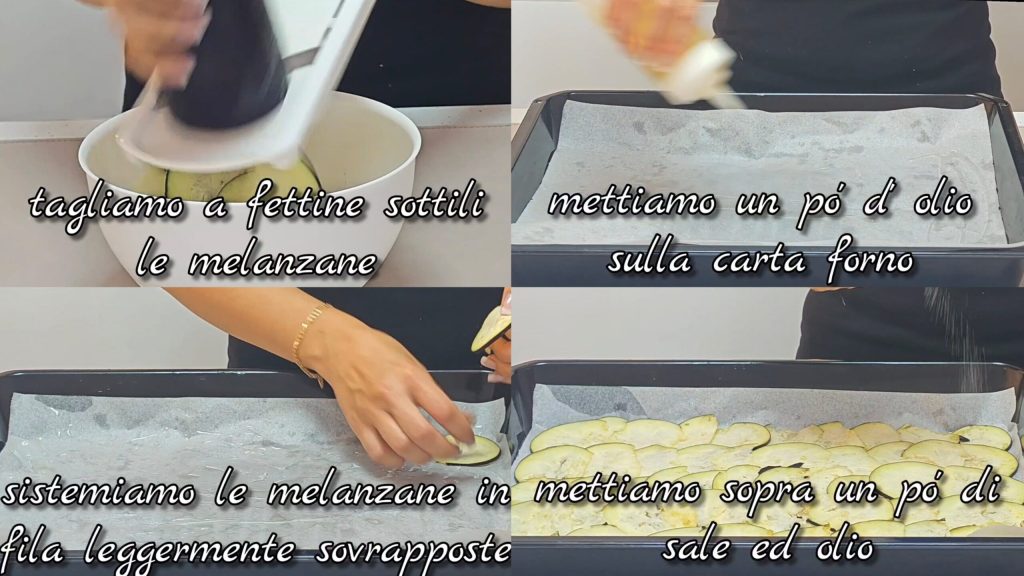 Snijd eerst de aubergines in heel dunne plakjes. Doe een beetje olie op het bakpapier en leg ze licht overlappend in een rij. Doe er een beetje zout en olie bovenop.