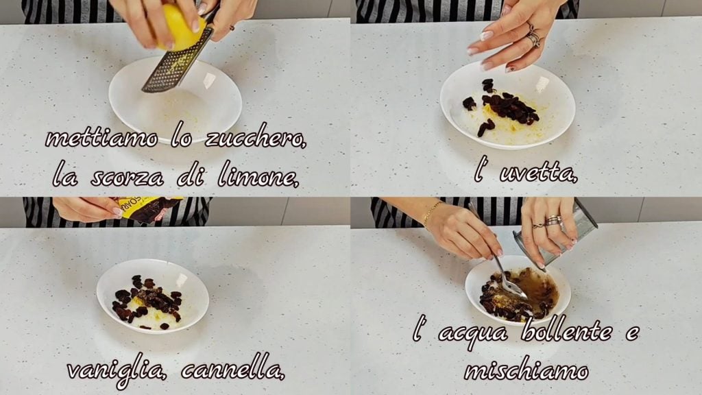 Doe de suiker, de citroenschil, rozijnen, vanille, kaneel, het kokende water en meng alles.