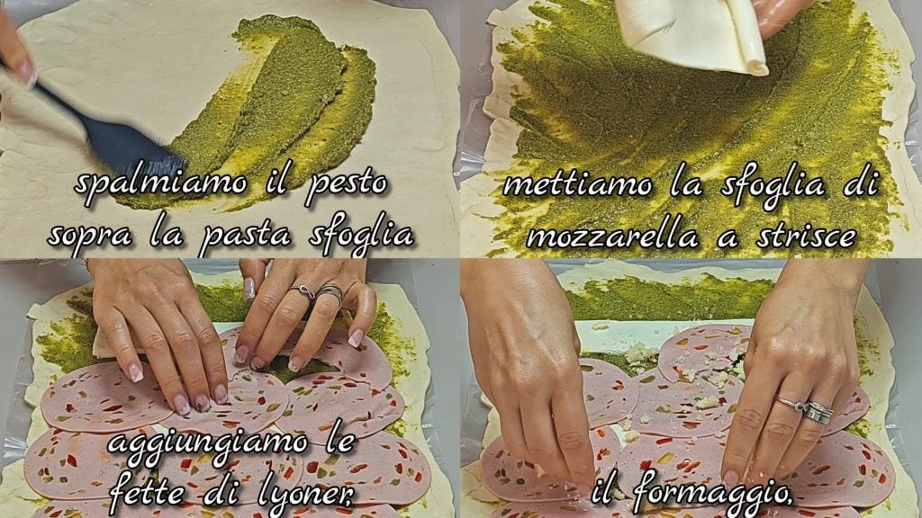 Smeer de pesto op het bladerdeeg, leg er de mozzarella in reepjes, de plakjes Lyoner en de kaas op.
