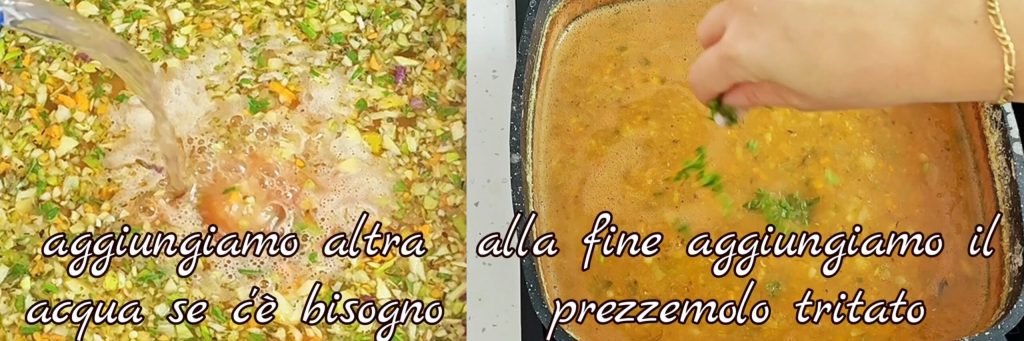Indien nodig voegen we meer water toe en roeren we af en toe. Aan het einde voegen we veel fijngehakte peterselie toe!