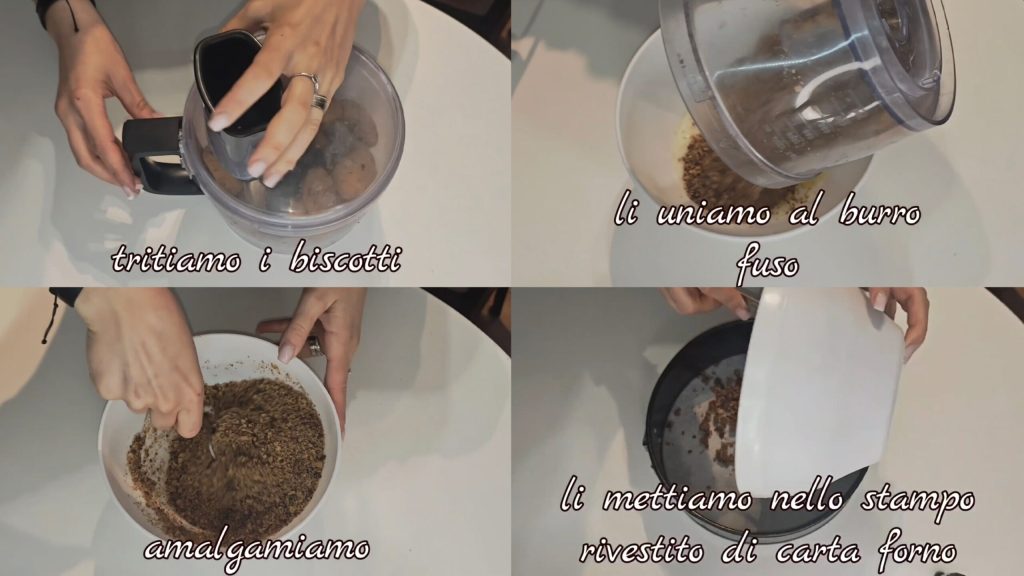 Als eerste malen we de koekjes en mengen ze met gesmolten boter. We plaatsen ze in de met bakpapier beklede vorm.