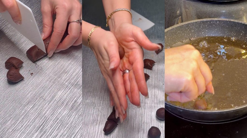 we snijden ze in stukjes van de gewenste grootte en vormen met onze handen bolletjes. Verhit de zonnebloemolie en frituur de bolletjes in hete olie, een paar tegelijk.