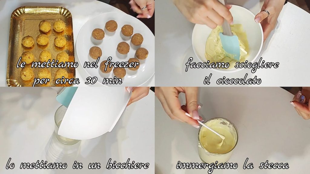 • Zet ze ongeveer 30 minuten in de vriezer. Smelt de witte chocolade, doe het in een glas en dompel de stok van de lolly erin.