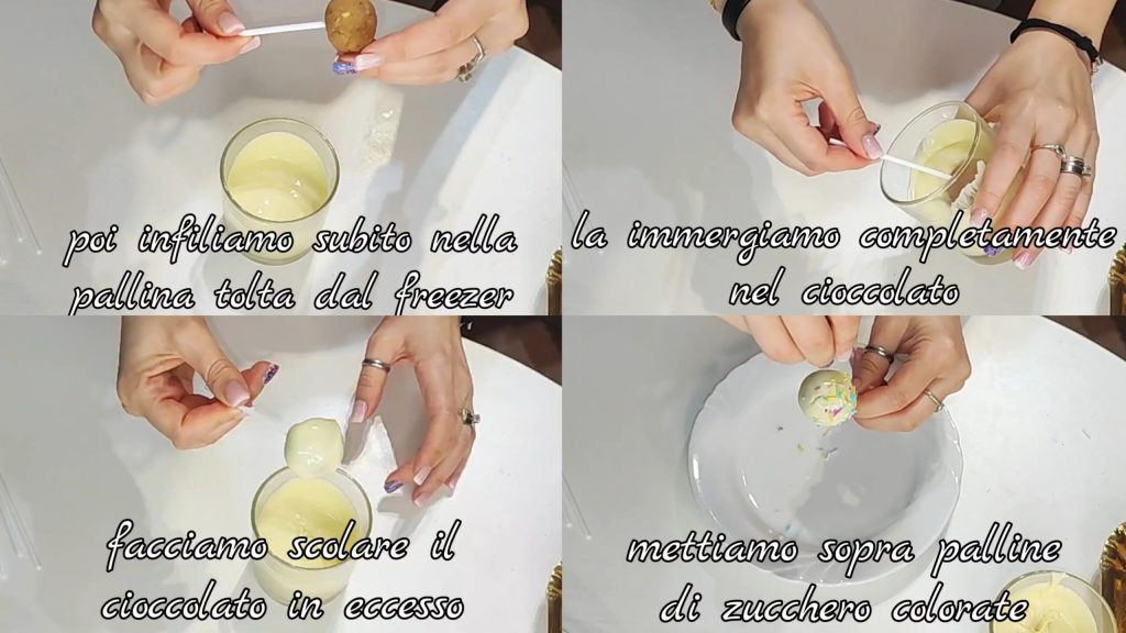 • Steek het dan meteen in het balletje dat uit de vriezer is gehaald en dompel vervolgens het balletje volledig in de chocolade. Laat de overtollige chocolade uitlekken en strooi de gekleurde suikerbolletjes erover. Zet ze rechtop zodat de chocolade hard kan worden. Ga zo verder met alle en gebruik ook pure of melkchocolade.