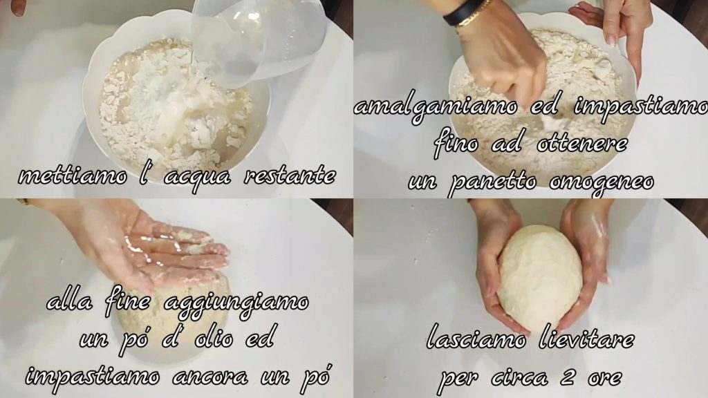 We voegen de rest van het water toe en mengen en kneden tot we een homogeen mengsel krijgen. Tenslotte doen we een beetje olie en blijven we een paar minuten kneden. We laten het ongeveer 2 uur rijzen op een warme plaats.