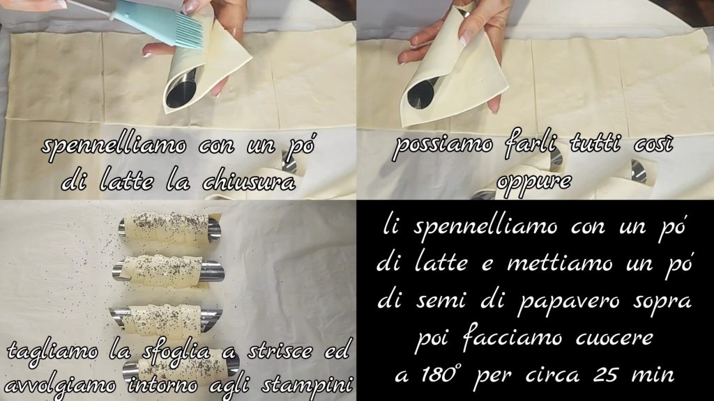 • Bestrijk de sluiting met een beetje melk om te voorkomen dat ze tijdens het bakken openen. We kunnen ze allemaal zo maken of we snijden alle stroken en wikkelen ze rond de mallen. Bestrijk ze bovenop met een beetje melk en strooi er zaden naar keuze over. Bak ze ongeveer 25 minuten op 180°.