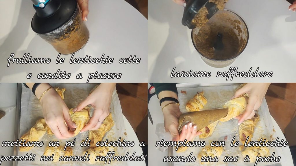 • Intussen mixen we de gekookte linzen en kruiden naar smaak en laten we ze afkoelen. Doe wat stukjes cotechino in de gebakken en afgekoelde cannoli en vul ze met de linzencrème met behulp van een spuitzak.