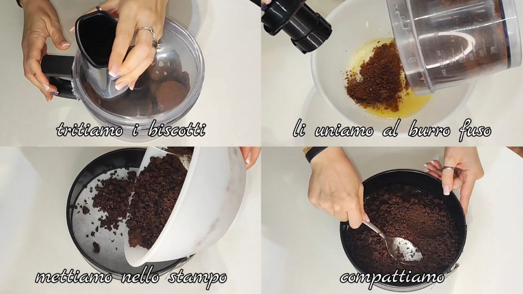 We malen de koekjes fijn en voegen ze toe aan de gesmolten boter. We plaatsen het verkregen mengsel in de vorm met bakpapier erin en drukken aan.