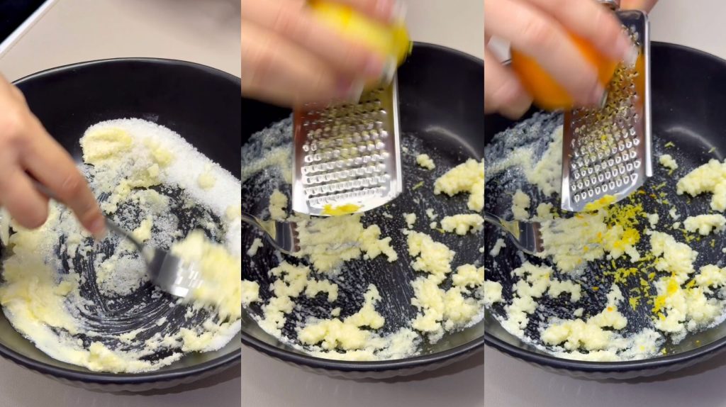 In een kom doen we de suiker, margarine, citrusrasp en een snufje zout,