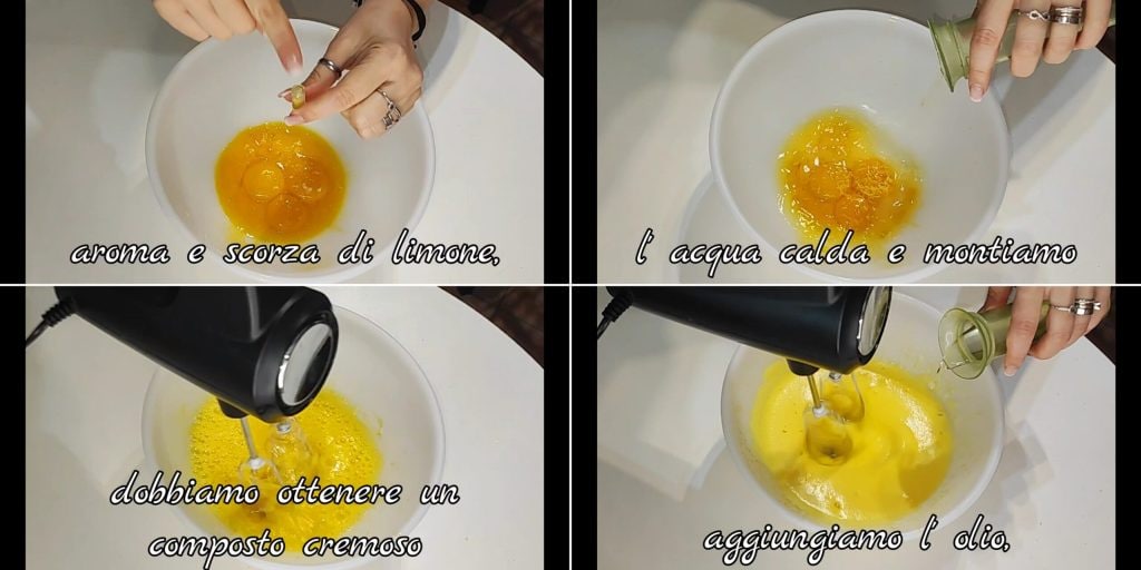 aroma en citroenschil, het hete water en klop ook deze. We moeten een romig mengsel verkrijgen. Voeg de olie toe.