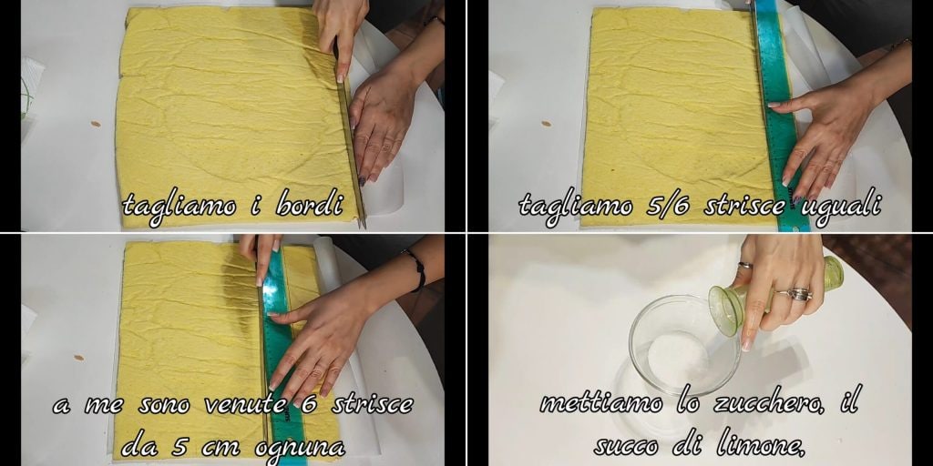 Snij de randen af en snij dan 5/6 gelijke stroken (ik had 6 stroken van 5 cm elk). Bereiding van de siroop: in een kom doen we de suiker, het citroensap.