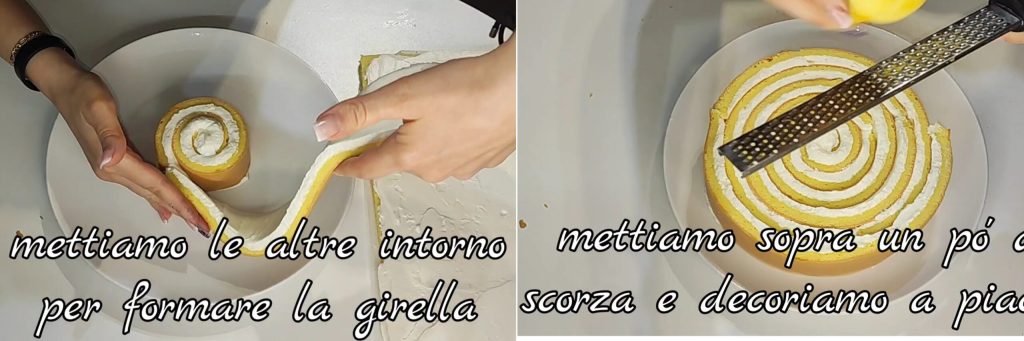 Plaats de andere stroken eromheen om de rolcake te vormen (bekijk de video). Strooi nog een beetje citroenschil er bovenop en decoreer naar wens!