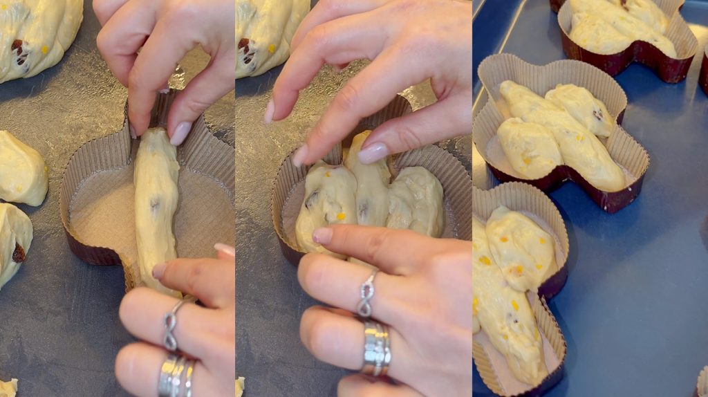 Het grootste stuk rek ik uit en plaats ik in het midden om het lichaam van de colomba te vormen.