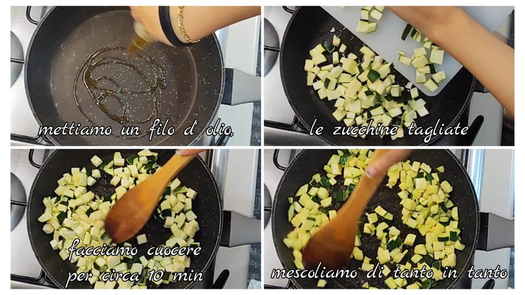 In een pan doen we een beetje olie, de gesneden courgettes en laten ze ongeveer 10 minuten koken, af en toe roerend.