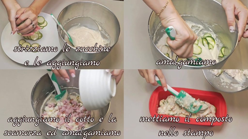 Knijp de courgettes uit en voeg ze toe aan het mengsel, meng goed. Voeg ook de ham en scamorza toe en meng. Doe het verkregen mengsel in de vorm.
