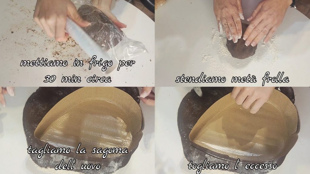 Leg het in de koelkast voor ongeveer 30 min. Na ongeveer 30 minuten rollen we de helft van het deeg uit, eventueel met wat bloem. Snijd de vorm van het ei en verwijder het overtollig deeg.