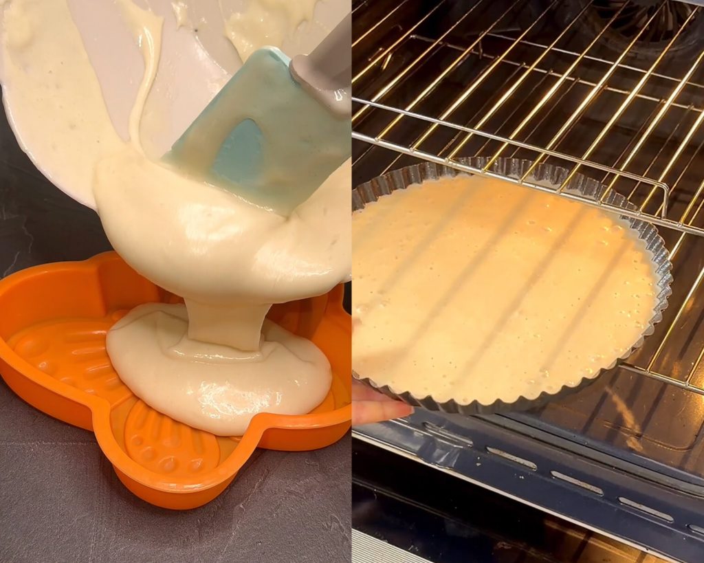 • Houd een beetje beslag apart en giet dat in een kleinere vorm; dat gebruiken we om de mimosa-blokjes te maken.