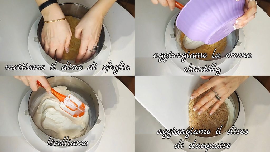 Voeg de schijf bladerdeeg toe (ik koos ervoor om het kleiner dan de vorm te maken). Voeg de crème chantilly toe en strijk glad. Voeg de schijf dacquoise toe (ook iets kleiner)