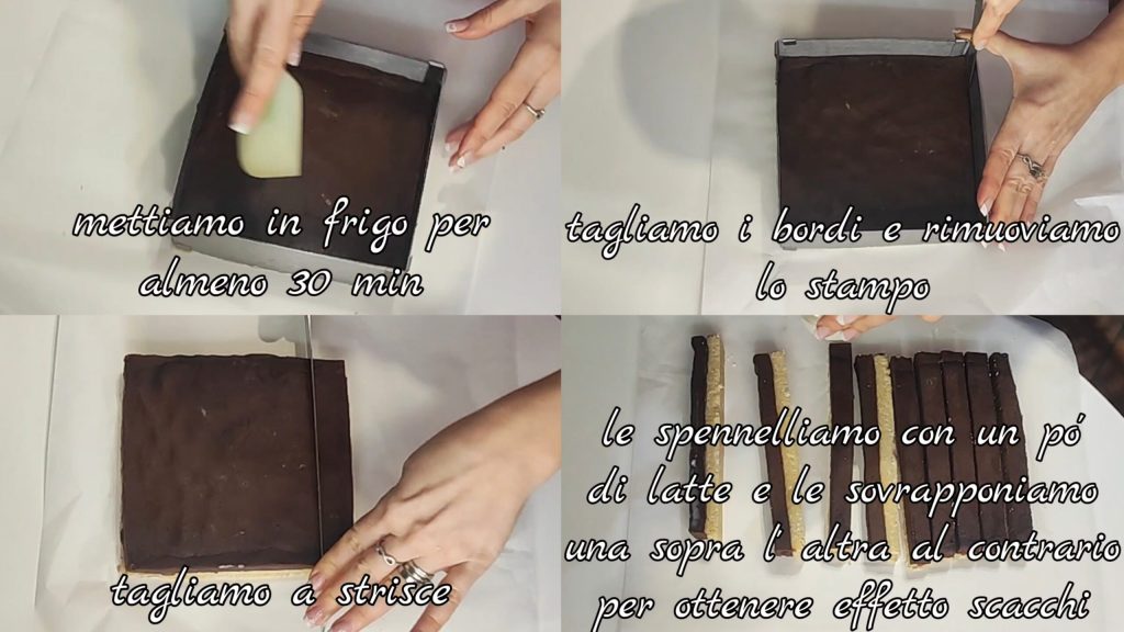 Leg het ongeveer 30 minuten in de koelkast, snijd dan de randen af en verwijder de mal. Snijd in stroken, bestrijk ze met een beetje melk en leg ze op elkaar voor het dambordeffect.