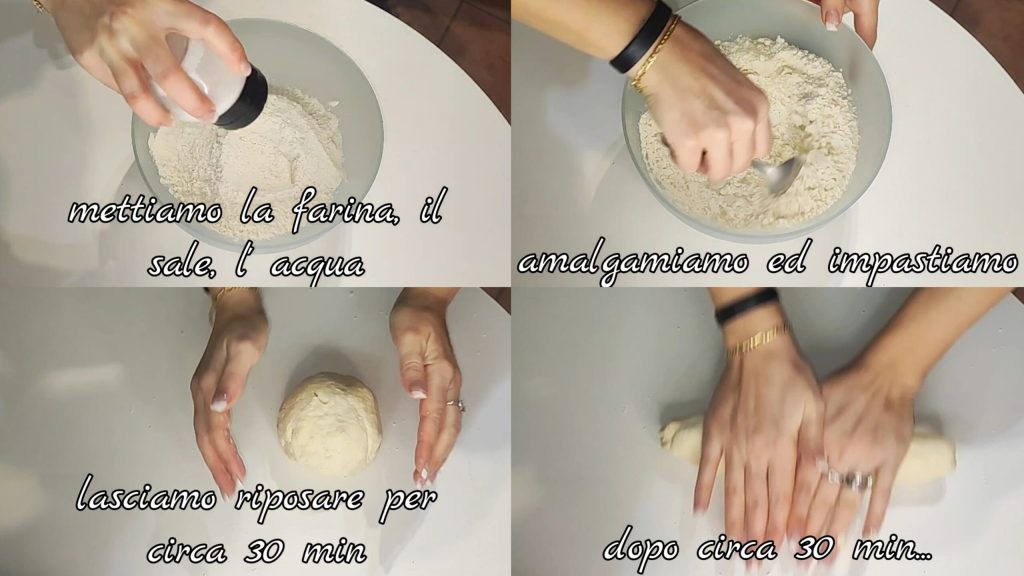 Doe de bloem, het zout en het water in een kom en meng en kneed tot een homogeen mengsel. Laat het ongeveer 30 minuten rusten.