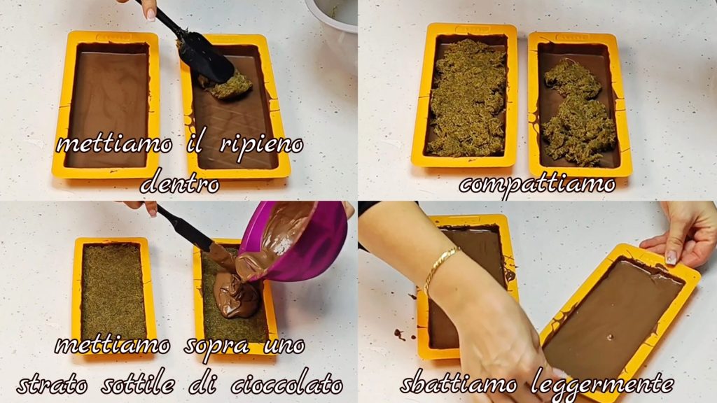 Na een paar minuten, wanneer de chocolade is uitgehard, voeg je de voorbereide vulling toe en druk je deze aan met een spatel. Smelt de resterende chocolade (ongeveer de helft) en bedek de hele oppervlakte. Klop lichtjes