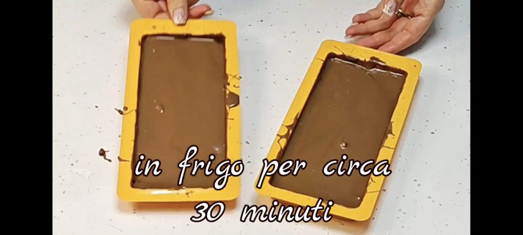 bedek de hele oppervlakte, inclusief de randen. Klop lichtjes om te egaliseren en zet ze dan een paar minuten in de koelkast om de chocolade te laten harden.