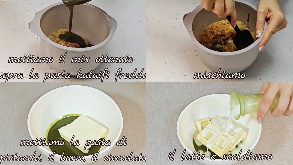 Doe de pistachepasta, boter, chocolade, melk in een kom en verwarm.