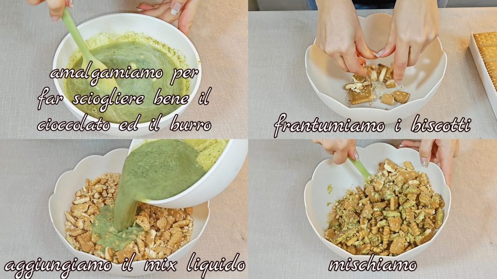 Meng om de chocolade en boter goed te laten smelten. Verkruimel de koekjes en voeg het voorbereide vloeibare mengsel toe. Goed mengen.