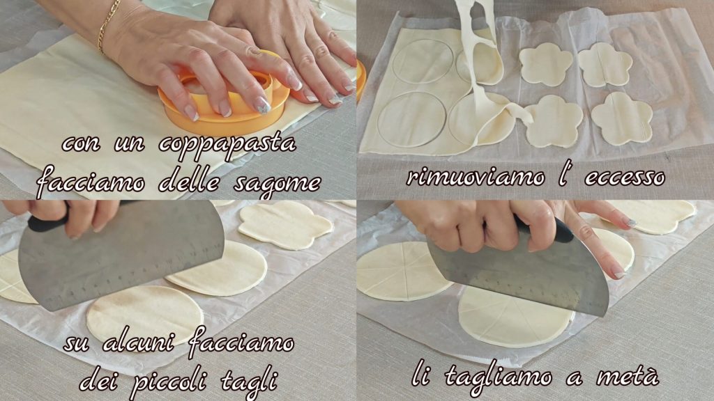 Rol het bladerdeeg uit en maak vormen met een uitsteekvorm. Verwijder de overtollige deeg. Maak op sommige cirkels kleine inkepingen en snijd ze doormidden.