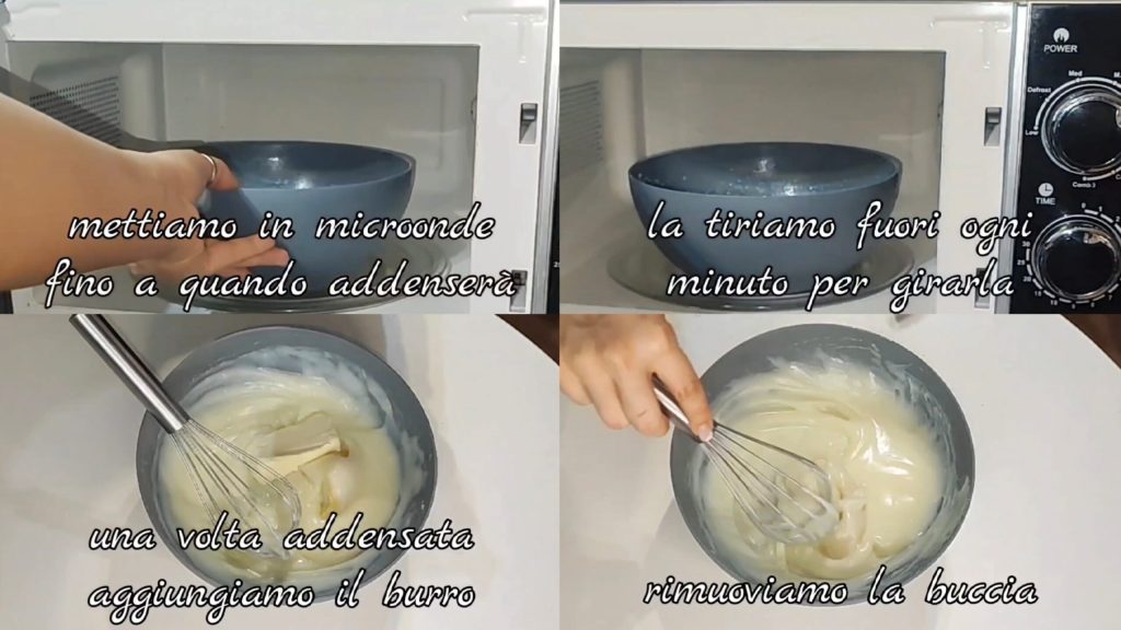 We koken het in de magnetron tot het indikt (dit duurt maar een paar minuten). We halen het elke minuut eruit om te roeren. Zodra het is ingedikt, voegen we de boter toe en verwijderen de schil.
