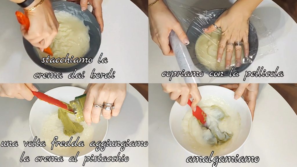 We scheiden het van de randen, bedekken het en laten het afkoelen. Als het koud is, voegen we de pistachecrème toe en mengen het.