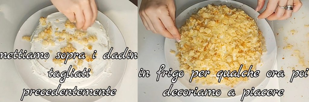 We plaatsen de eerder gesneden blokjes erop. Decoreren naar wens.