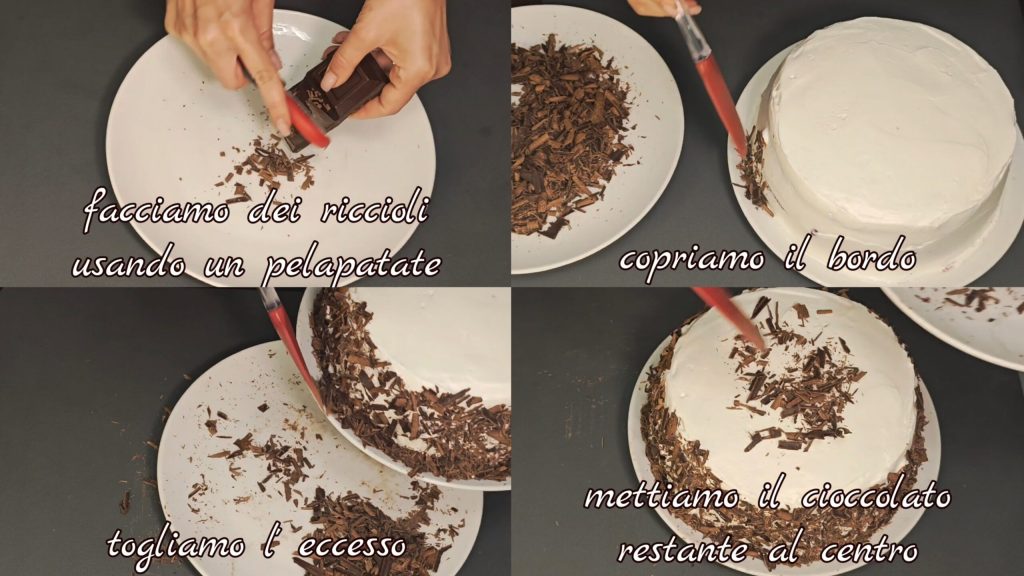 Met een dunschiller maken we chocoladekrullen en bedekken de rand van de taart. Verwijder eventueel overtollige. Plaats de resterende chocolade in het midden.