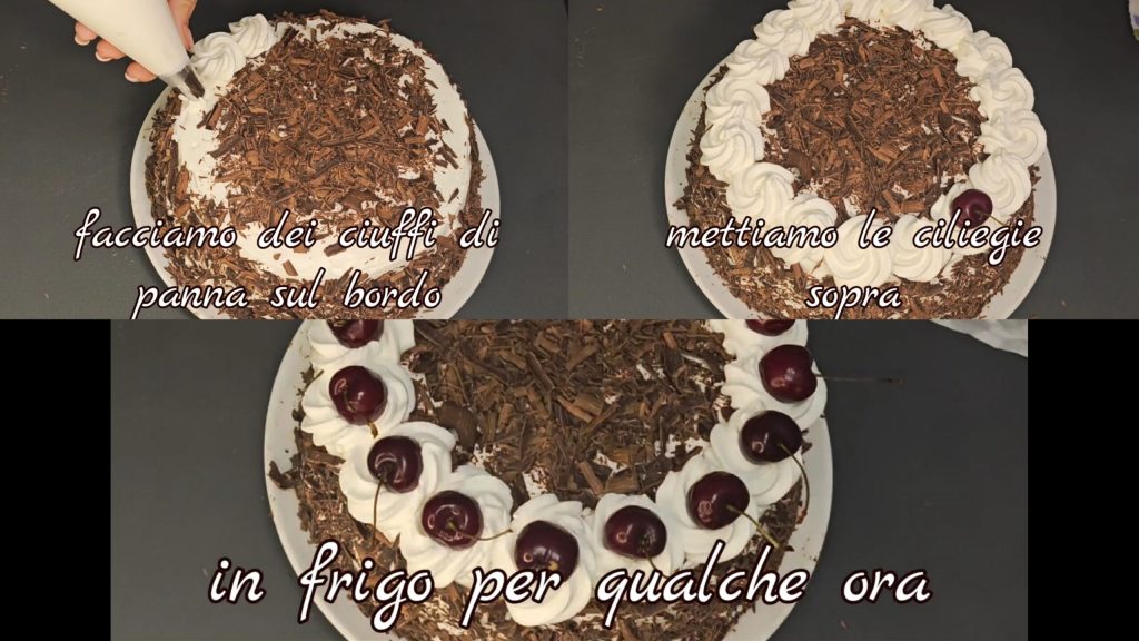 Maak slagroomrozetten op de rand en decoreer met kersen. Plaats een paar uur in de koelkast.
