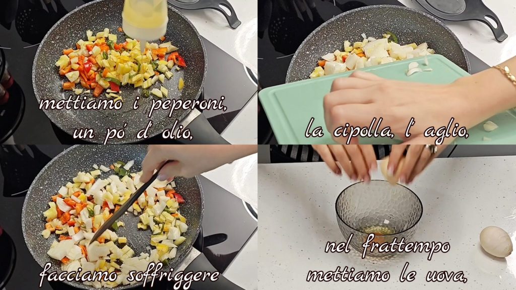Allereerst snijden we de paprika’s, doen een beetje olie, knoflook en ui in een pan en fruiten deze. Ondertussen kloppen we de eieren in een kom,