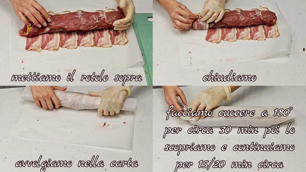 en leg de rol erop. Wikkel de spekplakken rond de rol. Wikkel de rol in bakpapier en bak op 180°C gedurende ongeveer 30 min, haal daarna het papier eraf en bak nog eens 15/20 min.
