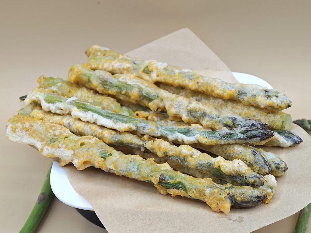 Gefrituurde asperges in beslag