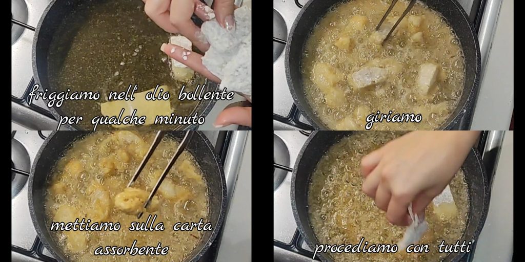 We zetten het 2/3 dagen in de koelkast en verversen het water 2 keer per dag. Na 2/3 dagen, laten we het goed uitlekken en bebloemen we het één voor één. We verwijderen de overtollige bloem.